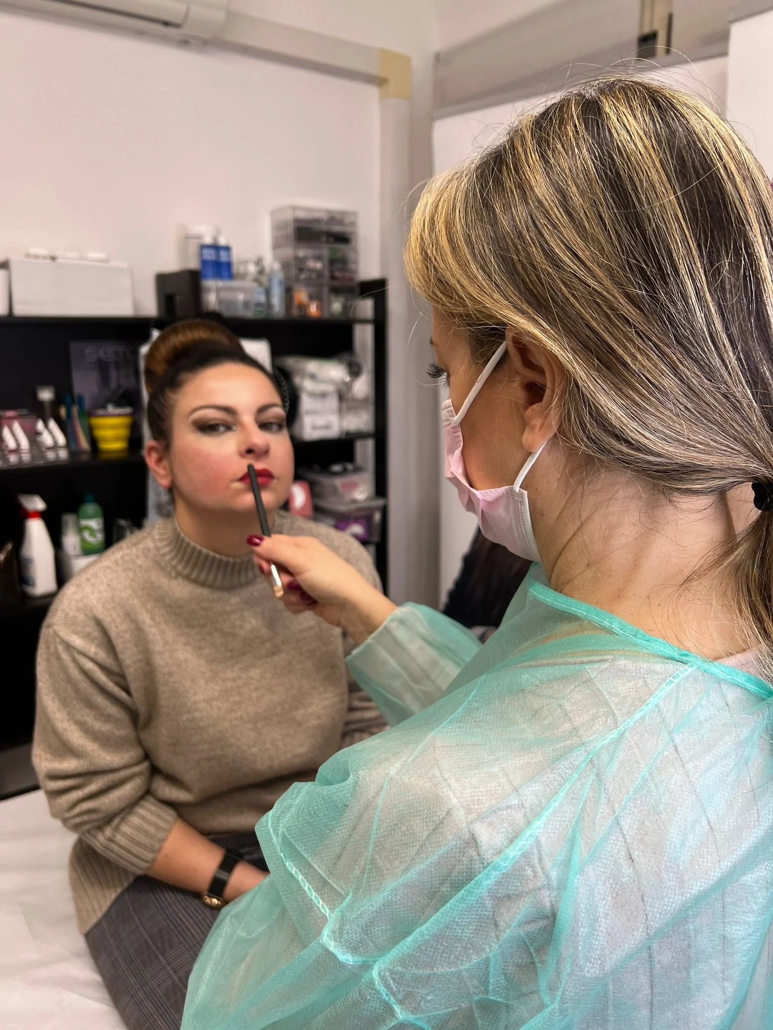 Tecnico esegue microblading sopracciglia su donna, indossa guanti, primo piano volto.
